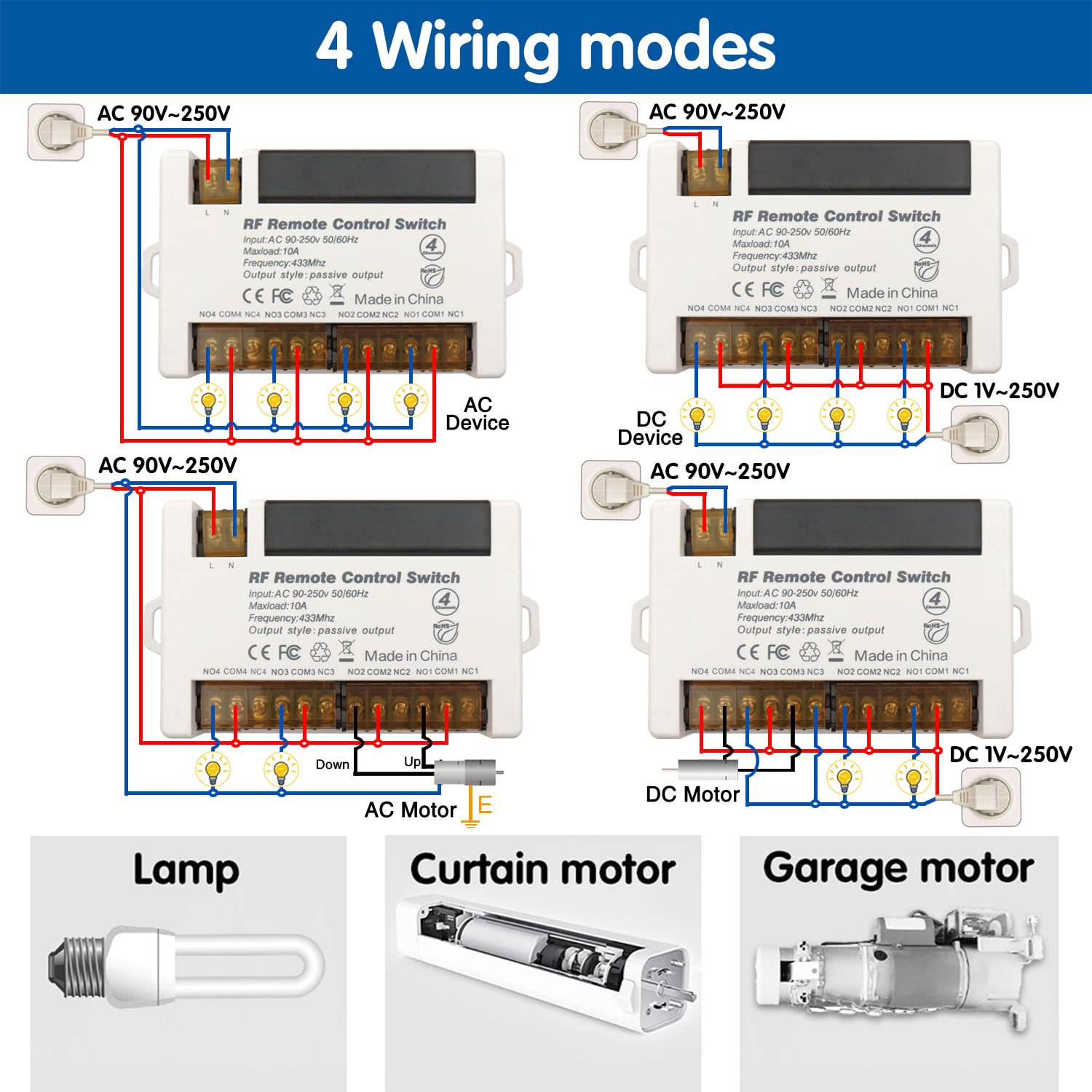 AENTIA 4 Channels Wireless Relay Remote Control Switch 433Mhz RF AC 110V 120V 220V 240V 10A Relay Receiver with 2 Transmitters Keyfob, Big Terminal Easy Wiring