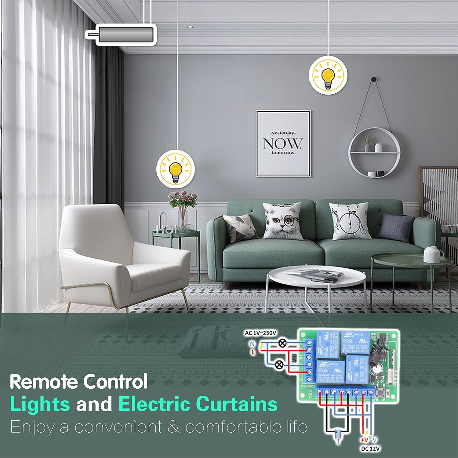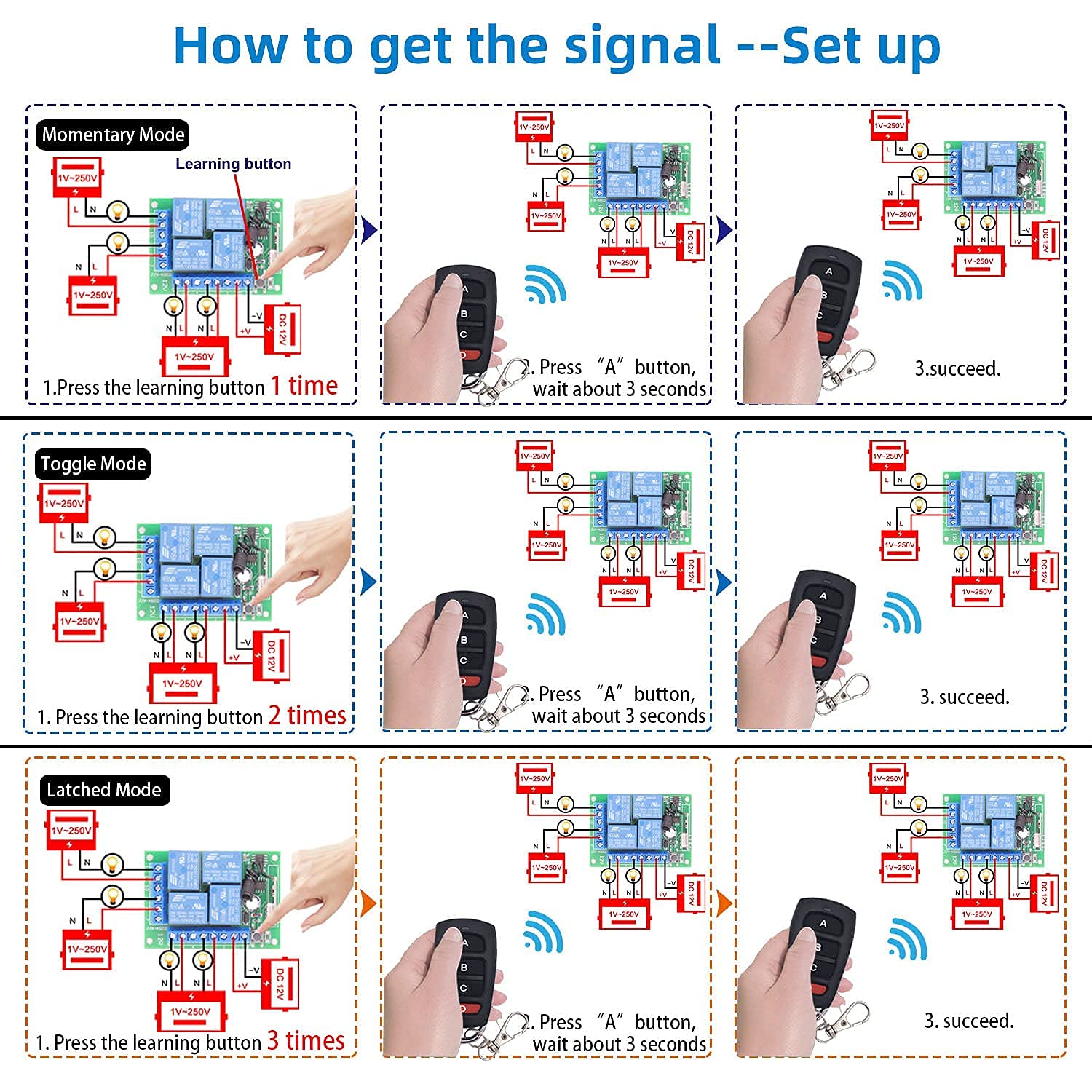AENTIA DC 12V Wireless Relay Remote Control Switch 433MHz RF 4 Channels Relay Receiver Board with 2 Transmitters for Truck Trunk Motor Garage Door Electric Lock, 3 Operating Modes